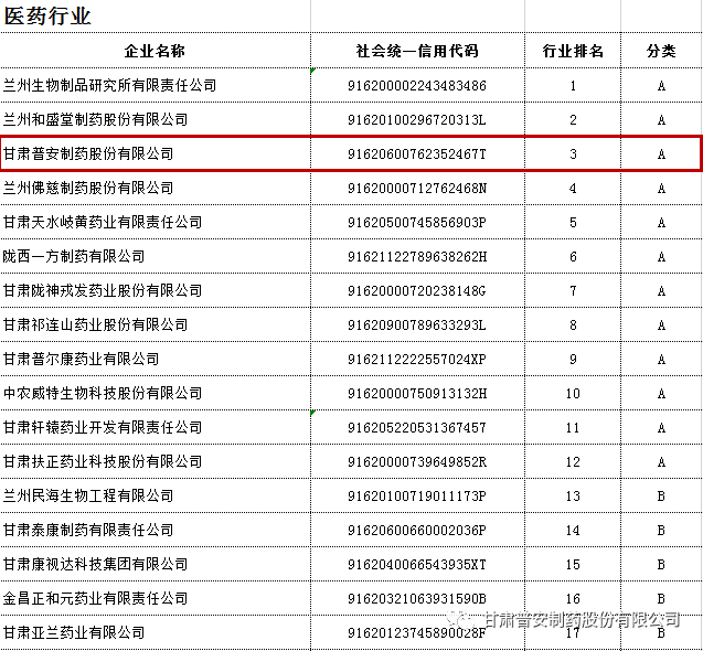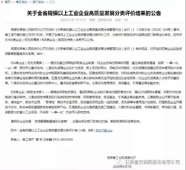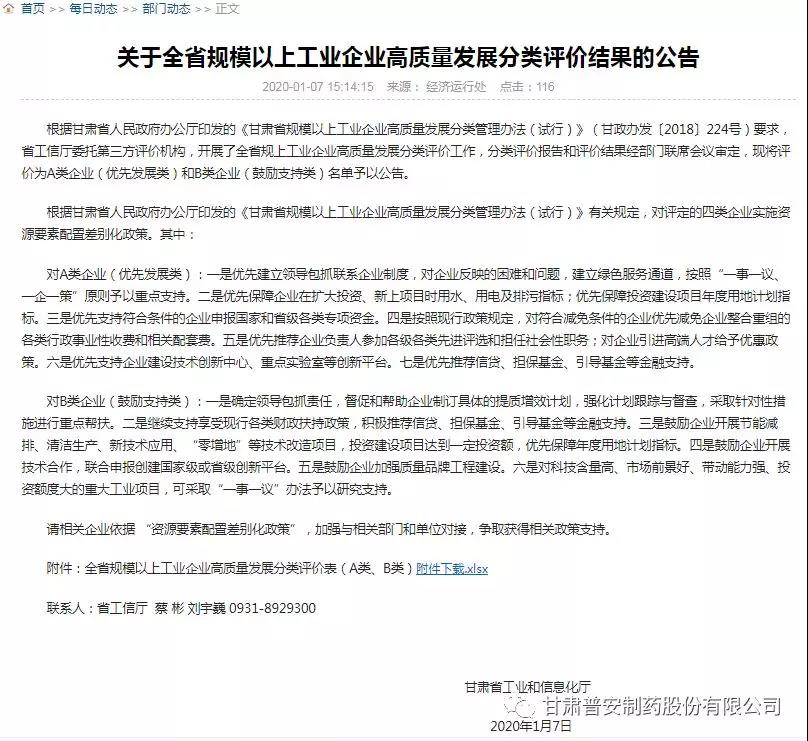 1月7日,根據(jù)甘肅省工業(yè)和信息化廳發(fā)布的“關于全省規(guī)模以上工業(yè)企業(yè)高質量發(fā)展分類評價結果”的公示,普安股份被評為全省規(guī)模以上工業(yè)企業(yè)高質量發(fā)展A類(優(yōu)先發(fā)展類)企業(yè),位列醫(yī)藥行業(yè)前三。此次分類評價工作經(jīng)專業(yè)第三方評價機構評審,分類評價報告和評價結果經(jīng)部門聯(lián)席會議審定,最終確定企業(yè)分類評價結果。普安股份將依據(jù) “資源要素配置差別化政策”對A類企業(yè)的規(guī)定,加強與相關部門和單位對接,爭取獲得相關政策支持。