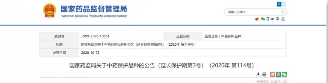 10月23日國(guó)家藥監(jiān)局發(fā)布中藥保護(hù)品種的公告(延長(zhǎng)保護(hù)期第3號(hào))(2020年第114號(hào))和 中藥保護(hù)品種公告(第5號(hào))(2020年第115號(hào)) 。甘肅普安制藥股份有限公司的“宣肺止嗽合劑”,保護(hù)級(jí)別為2,保護(hù)期限為7年。