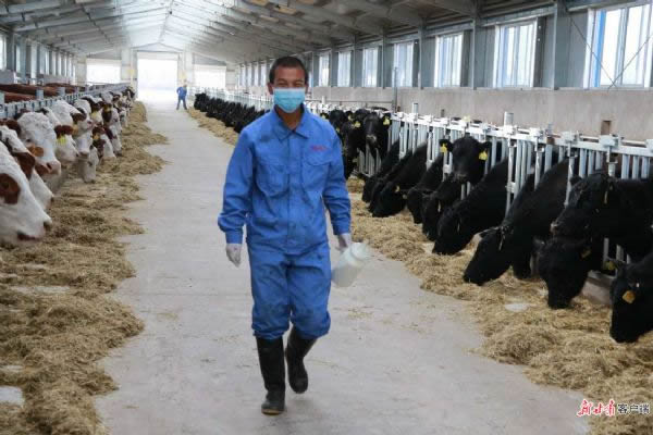 在甘肅農(nóng)墾飲馬牧業(yè)公司,18名黨員在生產(chǎn)一線奮戰(zhàn),牛群活動(dòng)情況監(jiān)測(cè)、飼料投喂、糞污清理等,每個(gè)崗位上大家一絲不茍地工作。