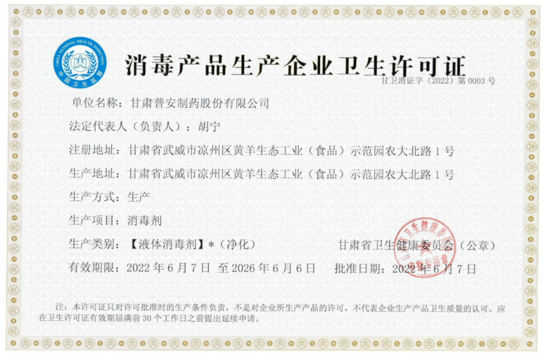 2022年6月7日,甘肅普安制藥股份有限公司(以下簡稱為“公司”)取得消毒產(chǎn)品生產(chǎn)企業(yè)衛(wèi)生許可證,9月6日完成消毒液衛(wèi)生安全評價工作,同時取得消毒液衛(wèi)生安全評價報告;相關(guān)資料已提交省衛(wèi)健委,10月份完成備案。