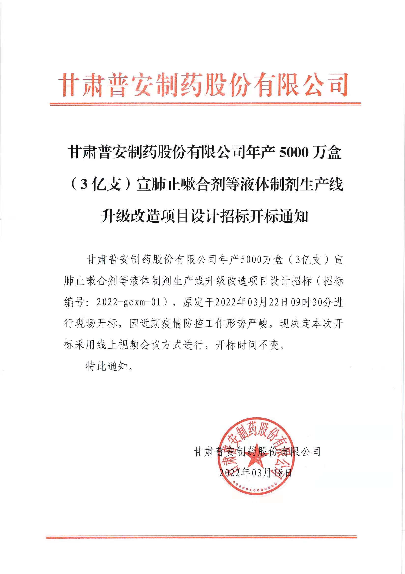 甘肅普安制藥股份有限公司年產(chǎn)5000萬(wàn)盒(3億支)宣肺止嗽合劑等液體制劑生產(chǎn)線升級(jí)改造項(xiàng)目設(shè)計(jì)招標(biāo)開(kāi)標(biāo)通知