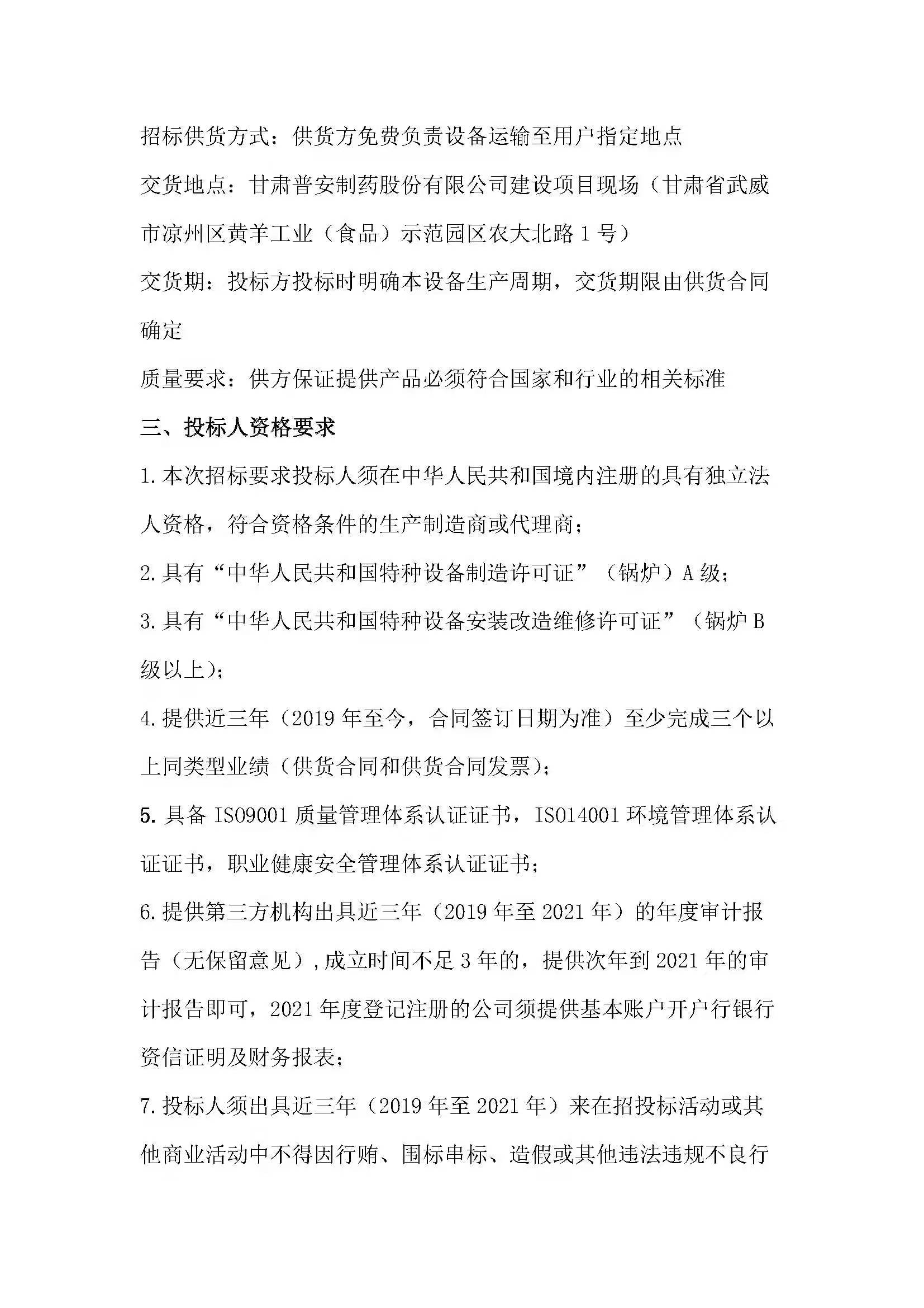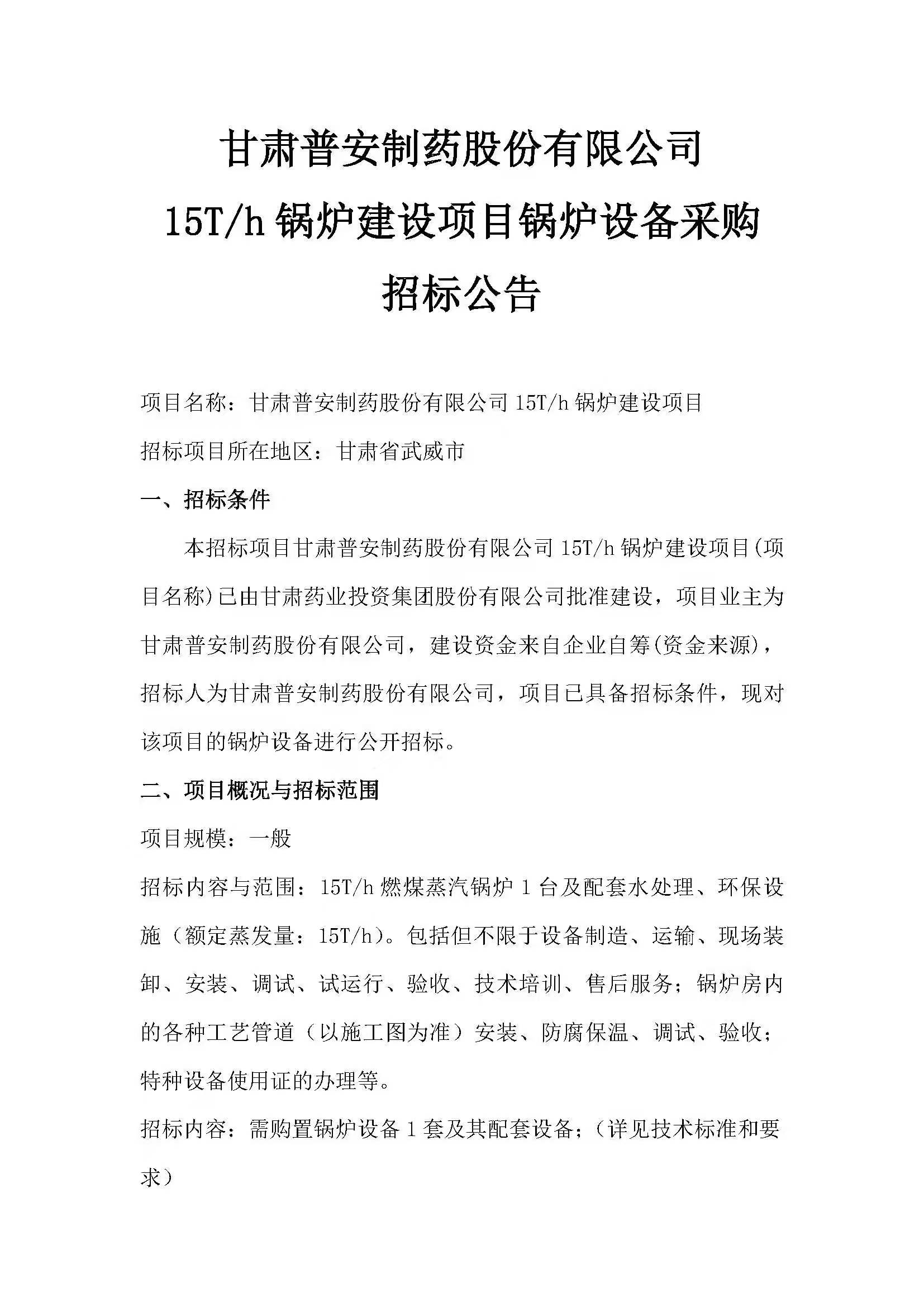 甘肅普安制藥股份有限公司15T/h鍋爐建設(shè)項目鍋爐設(shè)備采購招標公告