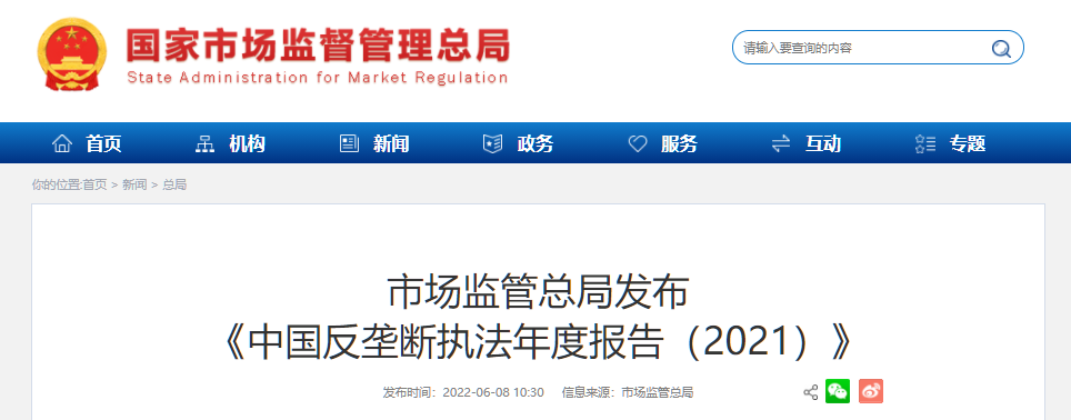 6月8日,國家市場監(jiān)督管理總局發(fā)布《中國反壟斷執(zhí)法年度報(bào)告(2021)》,(以下簡稱《報(bào)告》)!秷(bào)告》指出,2021年,我國市場公平競爭秩序穩(wěn)步向好,反壟斷和防止資本無序擴(kuò)張取得重要成效。
