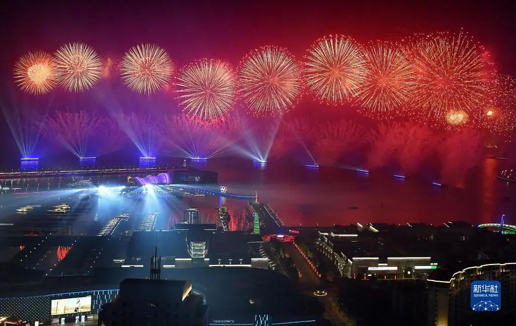 這是上合組織青島峰會(huì)期間舉行的《有朋自遠(yuǎn)方來(lái)》燈光焰火藝術(shù)表演(2018年6月9日攝)。新華社記者 李紫恒 攝