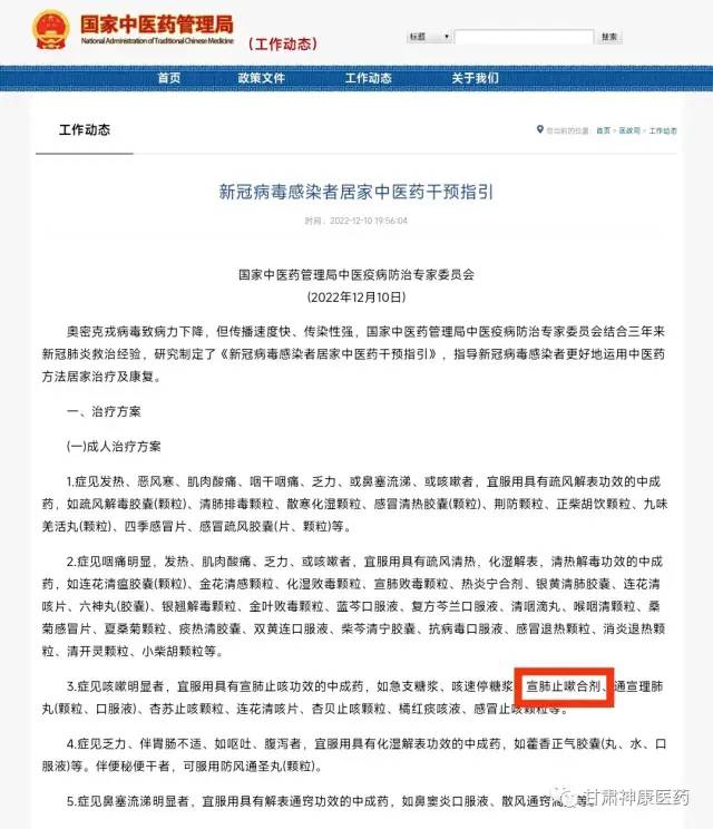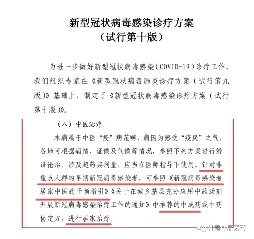 1月5日國家衛(wèi)生健康委辦公廳、國家中醫(yī)藥局綜合司發(fā)布的《新型冠狀病毒感染診療方案(試行第十版)》,在中醫(yī)治療部分,明確提出針對非重點人群的早期新冠病毒感染者,可參照《新冠病毒感染者居家中醫(yī)藥干預指引》《關(guān)于在城鄉(xiāng)基層充分應用中藥湯劑開展新冠病毒感染治療工作的通知》中推薦的中成藥或中藥協(xié)定方,進行居家治療。