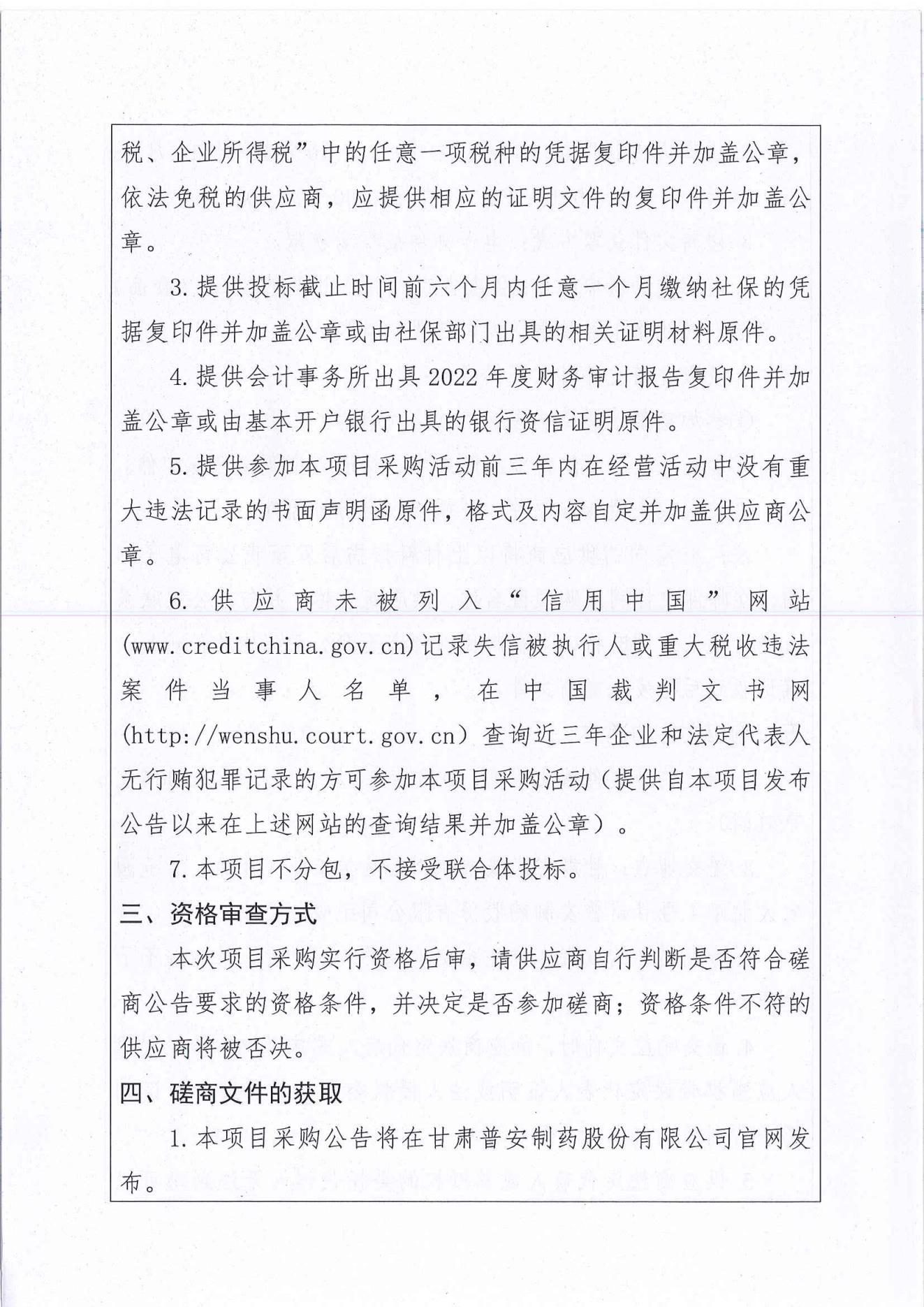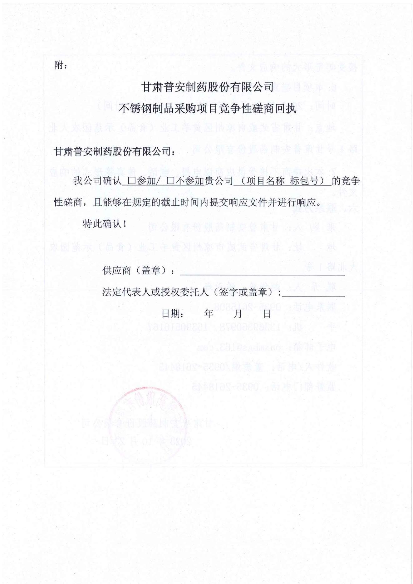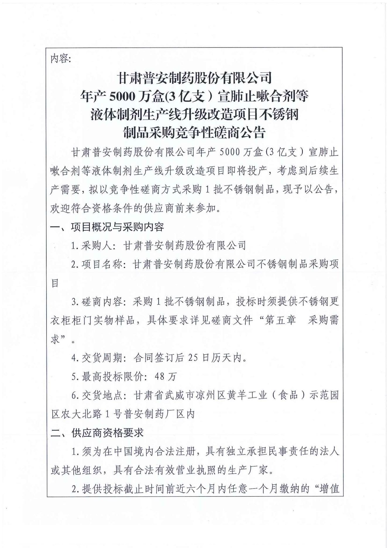 甘肅普安制藥股份有限公司年產(chǎn)5000萬(wàn)盒(3億支)宣肺止嗽合劑等液體制劑生產(chǎn)線升級(jí)改造項(xiàng)目不銹鋼制品采購(gòu)競(jìng)爭(zhēng)性磋商公告