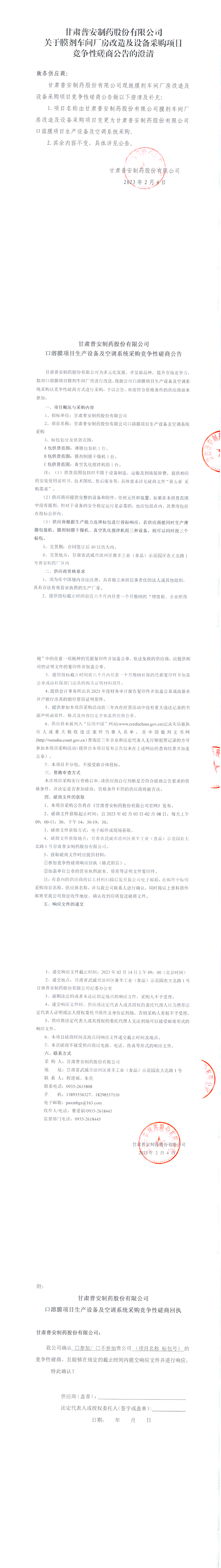 甘肅普安制藥股份有限公司關(guān)于膜劑車間廠房改造及設(shè)備采購(gòu)項(xiàng)目競(jìng)爭(zhēng)性磋商公告的澄清