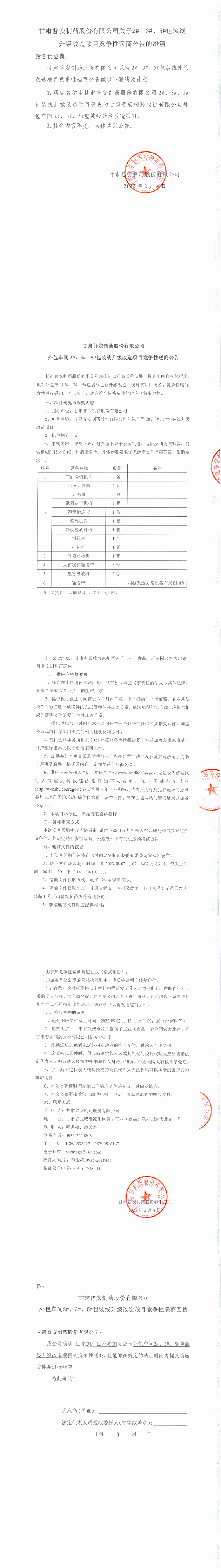 甘肅普安制藥股份有限公司關(guān)于2#、3#、5#包裝線升級(jí)改造項(xiàng)目競爭性磋商公告的澄清