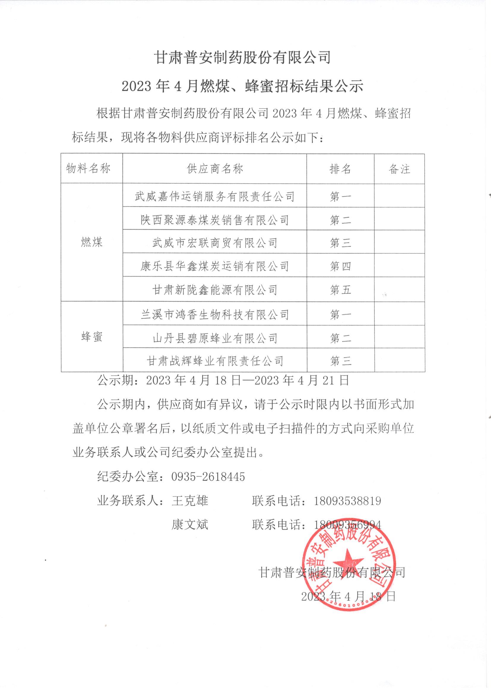 甘肅普安制藥股份有限公司2023年4月燃煤、蜂蜜招標(biāo)結(jié)果公示