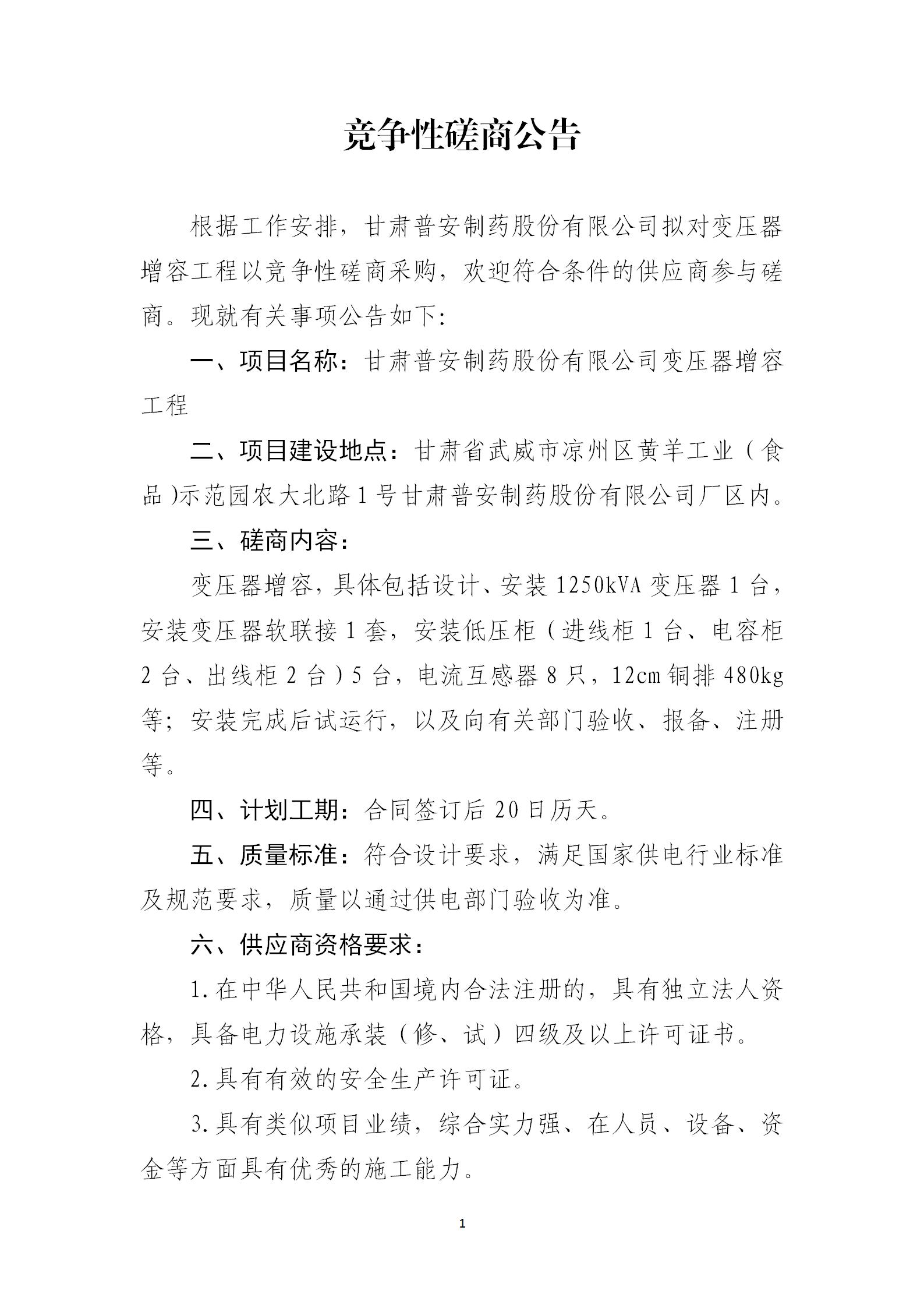 甘肅普安制藥股份有限公司變壓器增容工程競(jìng)爭(zhēng)性磋商公告