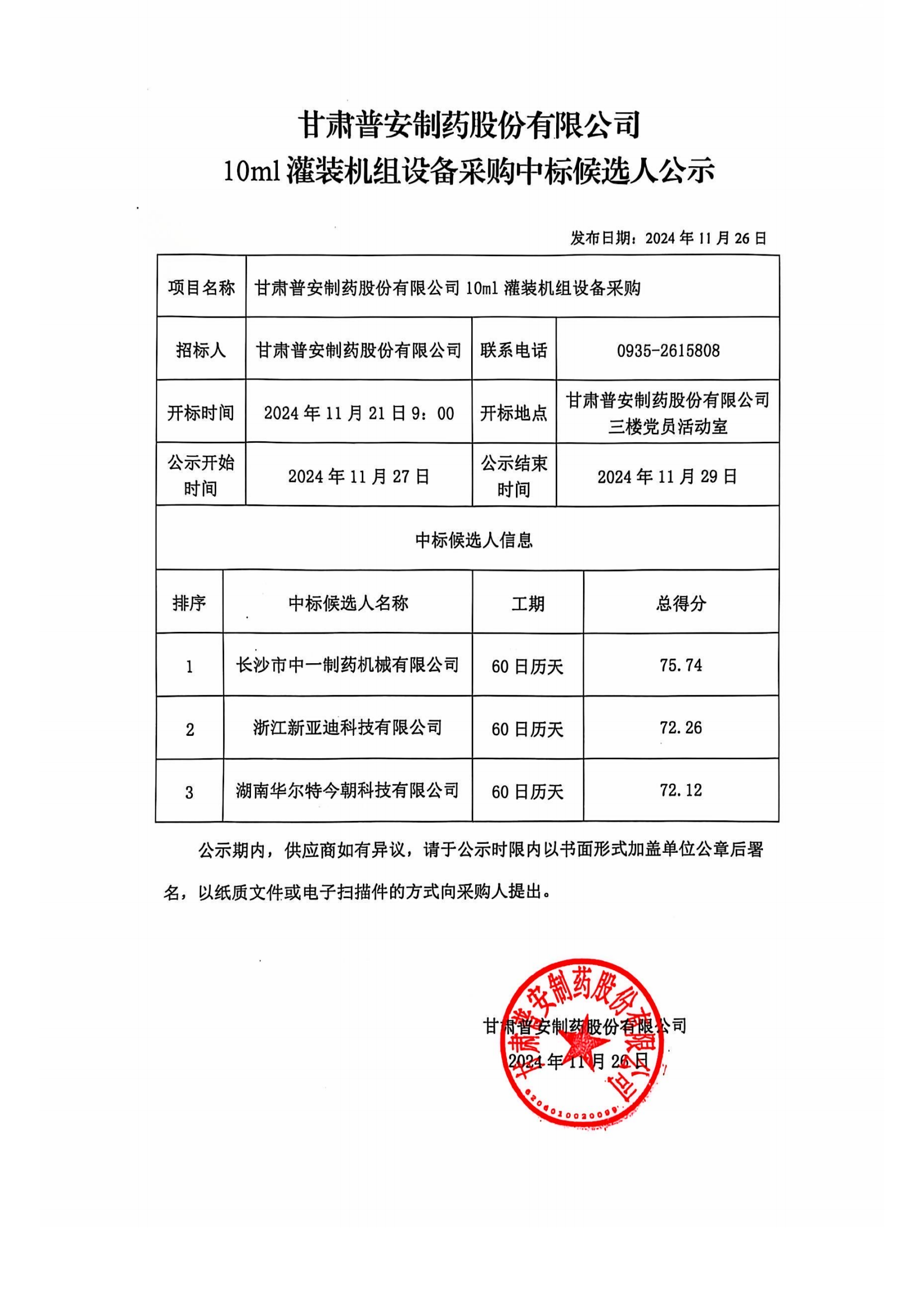 甘肅普安制藥股份有限公司10ml 灌裝機(jī)組設(shè)備采購中標(biāo)候選人公示