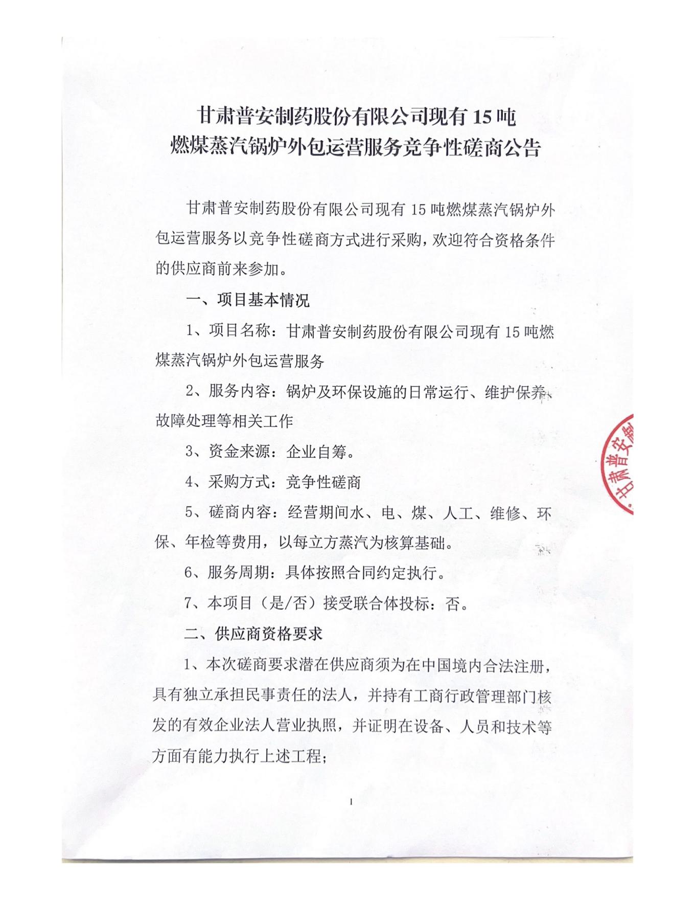甘肅普安制藥股份有限公司現(xiàn)有15噸燃煤蒸汽鍋爐外包運(yùn)營服務(wù)競爭性磋商公告