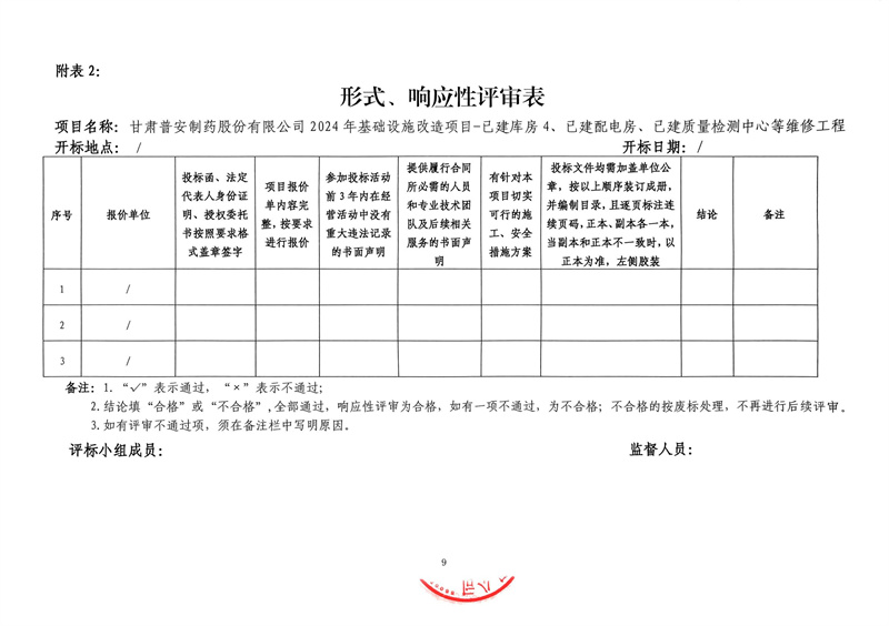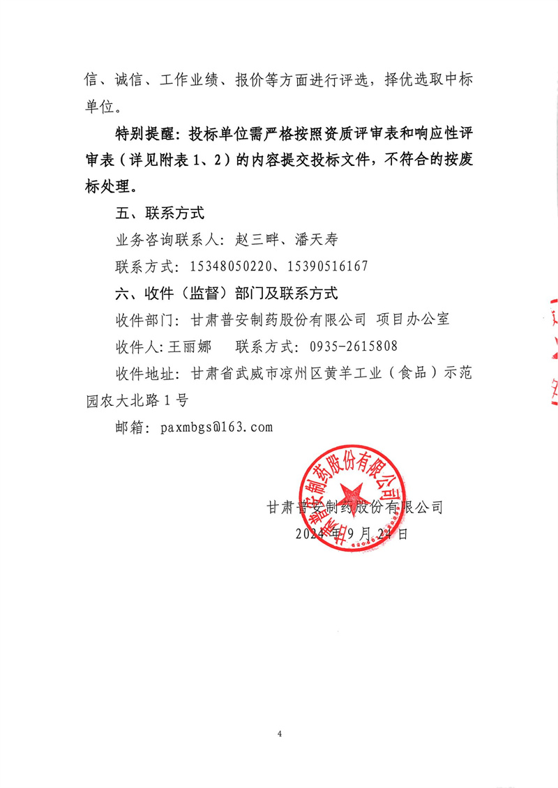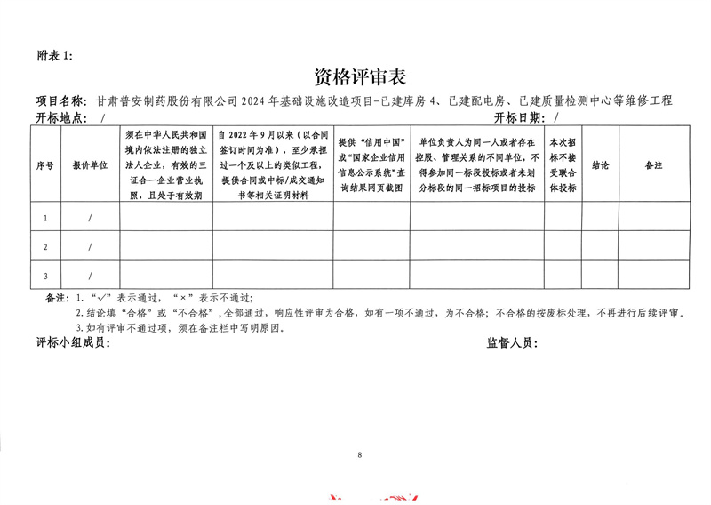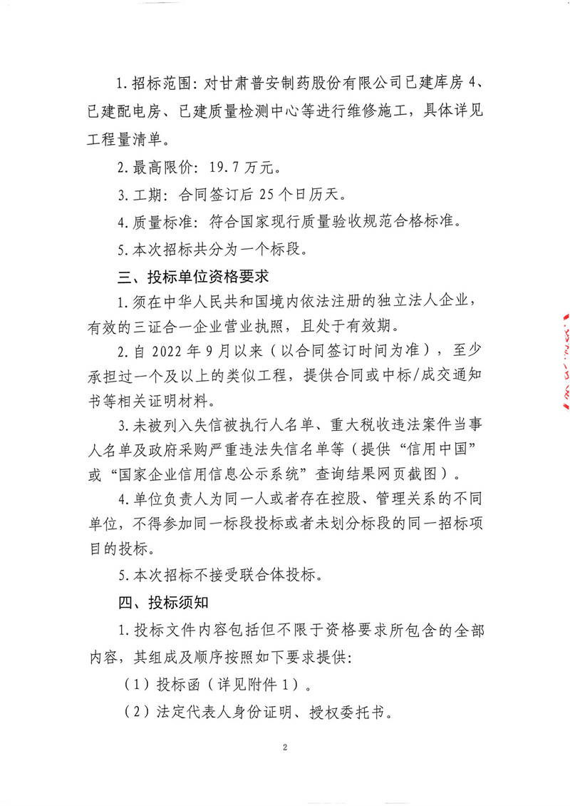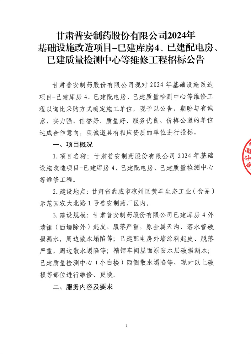 甘肅普安制藥股份有限公司2024年基礎(chǔ)設(shè)施改造項(xiàng)目-已建庫(kù)房4、已建配電房、已建質(zhì)量檢測(cè)中心等維修工程招標(biāo)公告