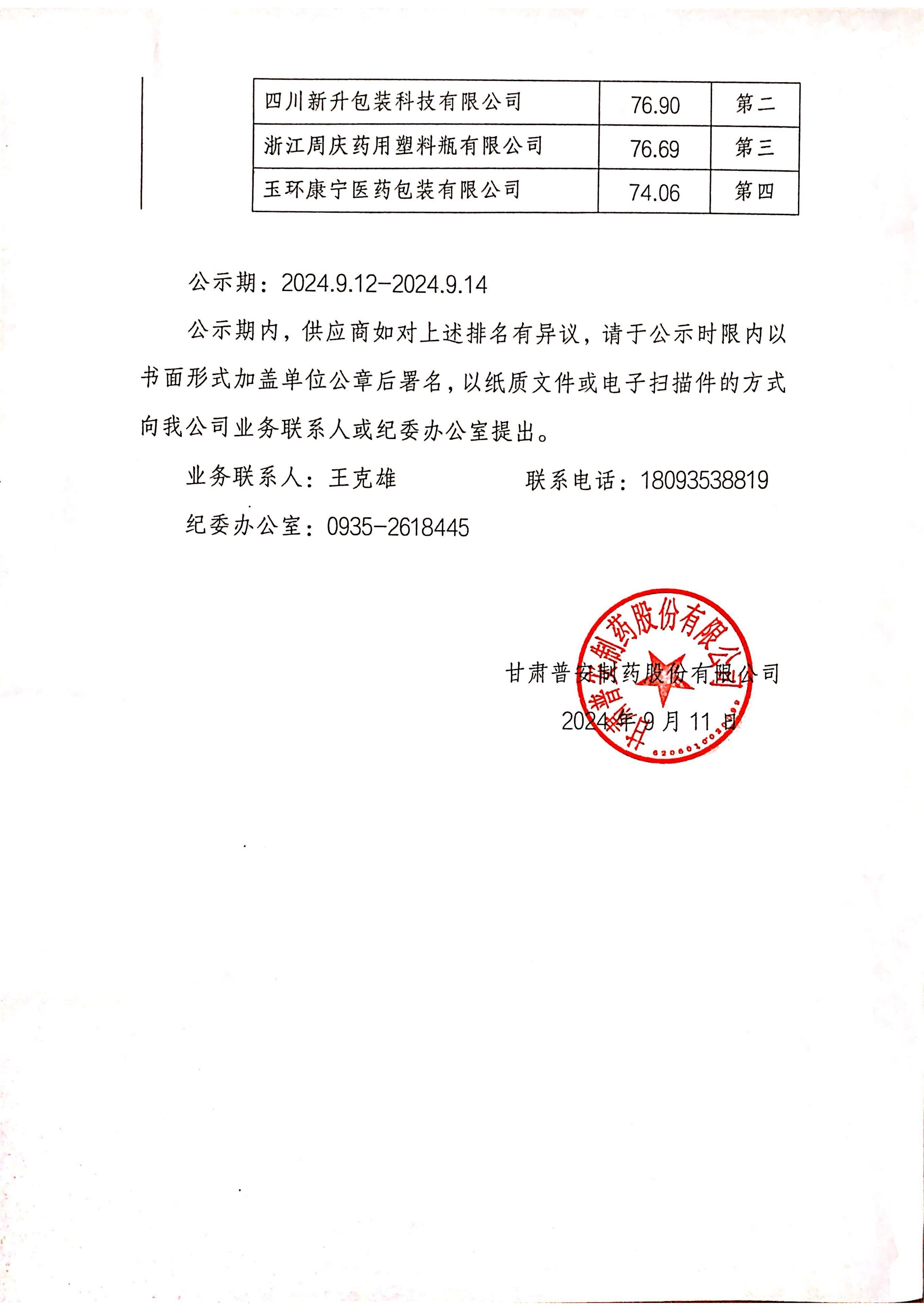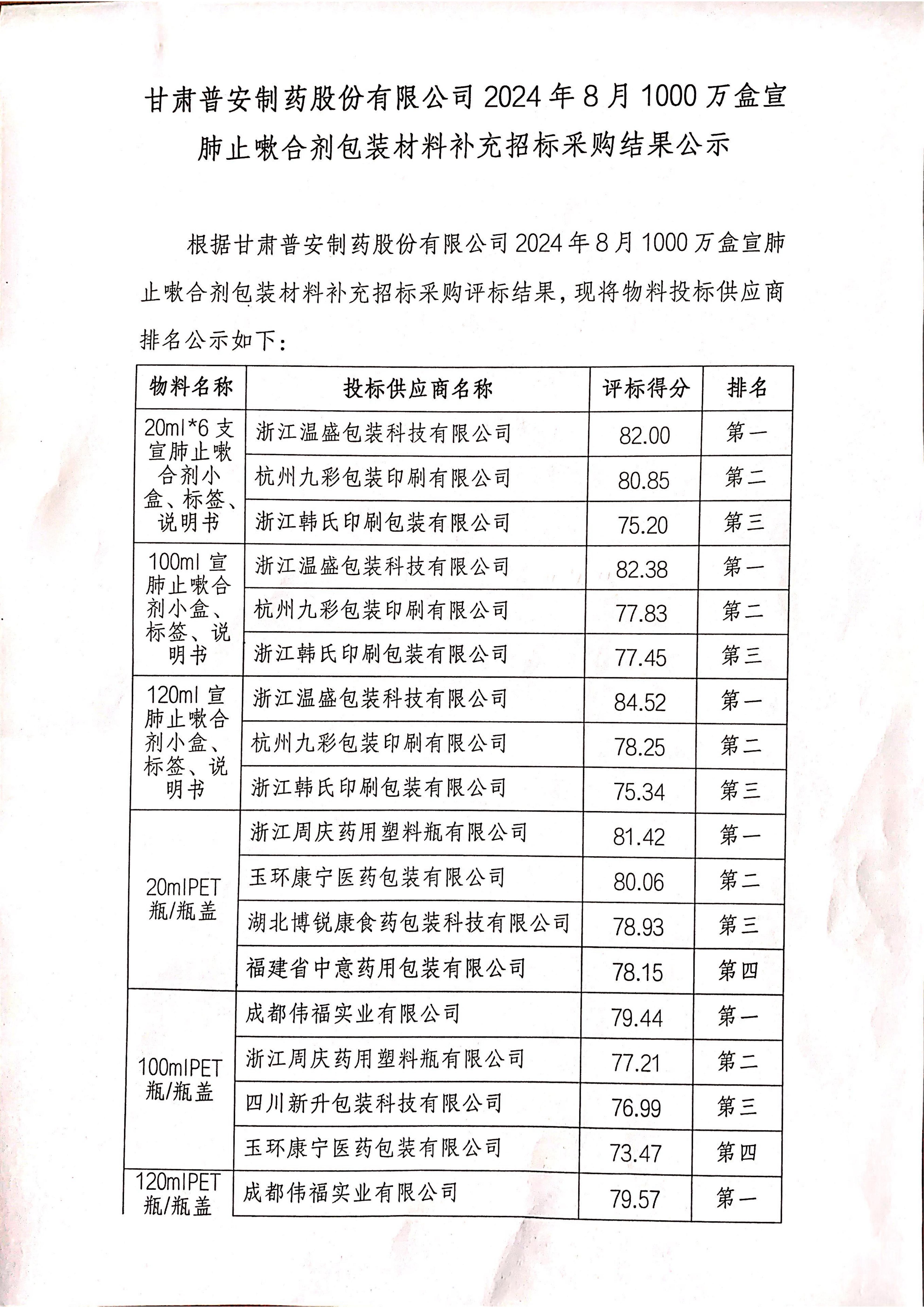 甘肅普安制藥股份有限公司2024年8月1000萬盒宣肺止嗽合劑包裝材料補(bǔ)充招標(biāo)采購(gòu)結(jié)果公示