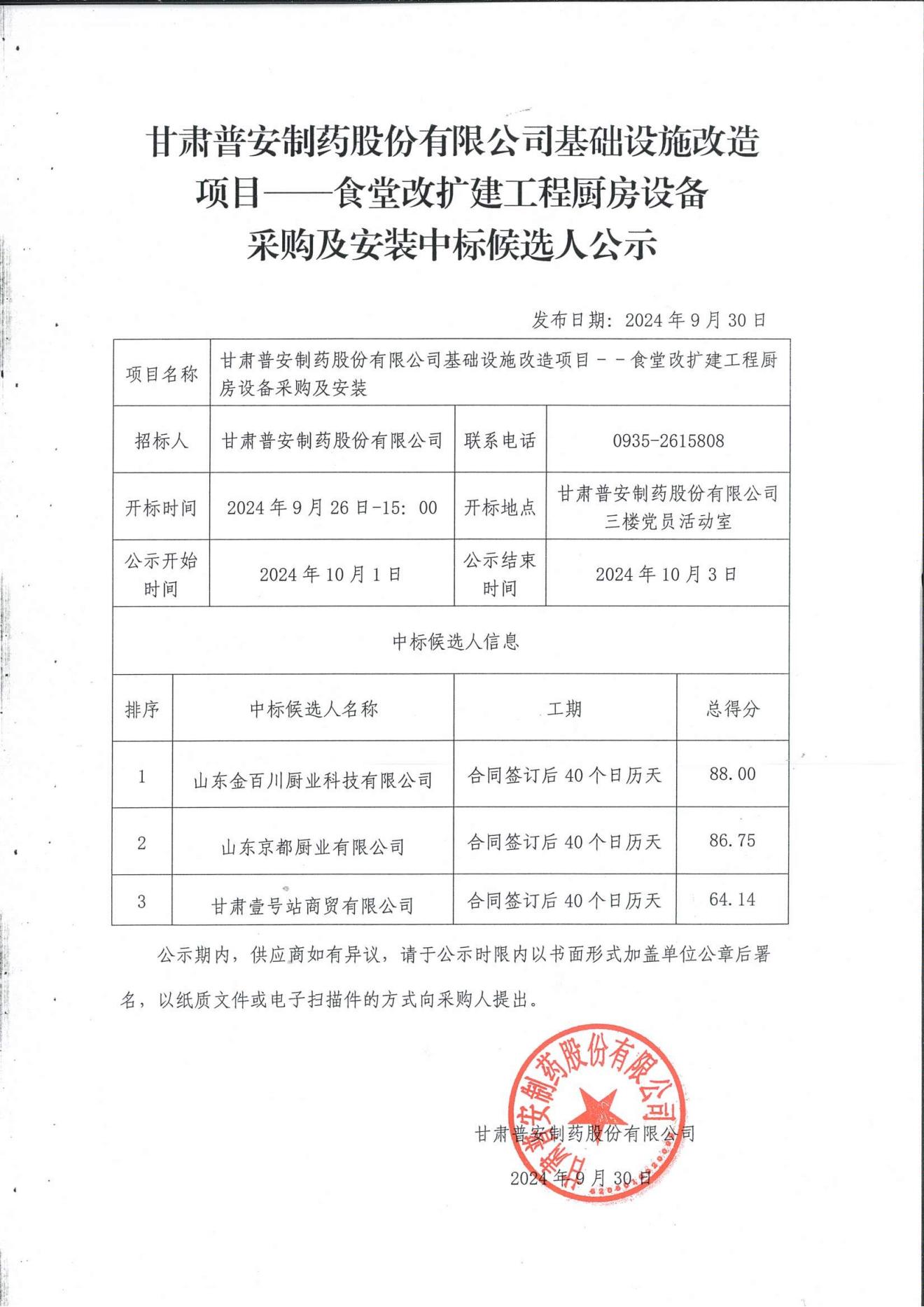 甘肅普安制藥股份有限公司基礎(chǔ)設(shè)施改造項目--食堂改擴建工程廚房設(shè)備采購及安裝中標候選人公示
