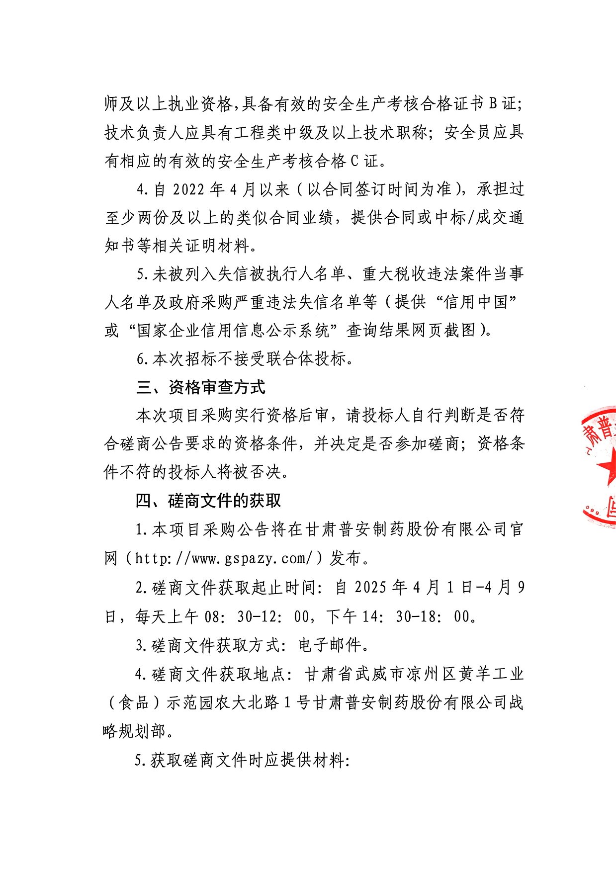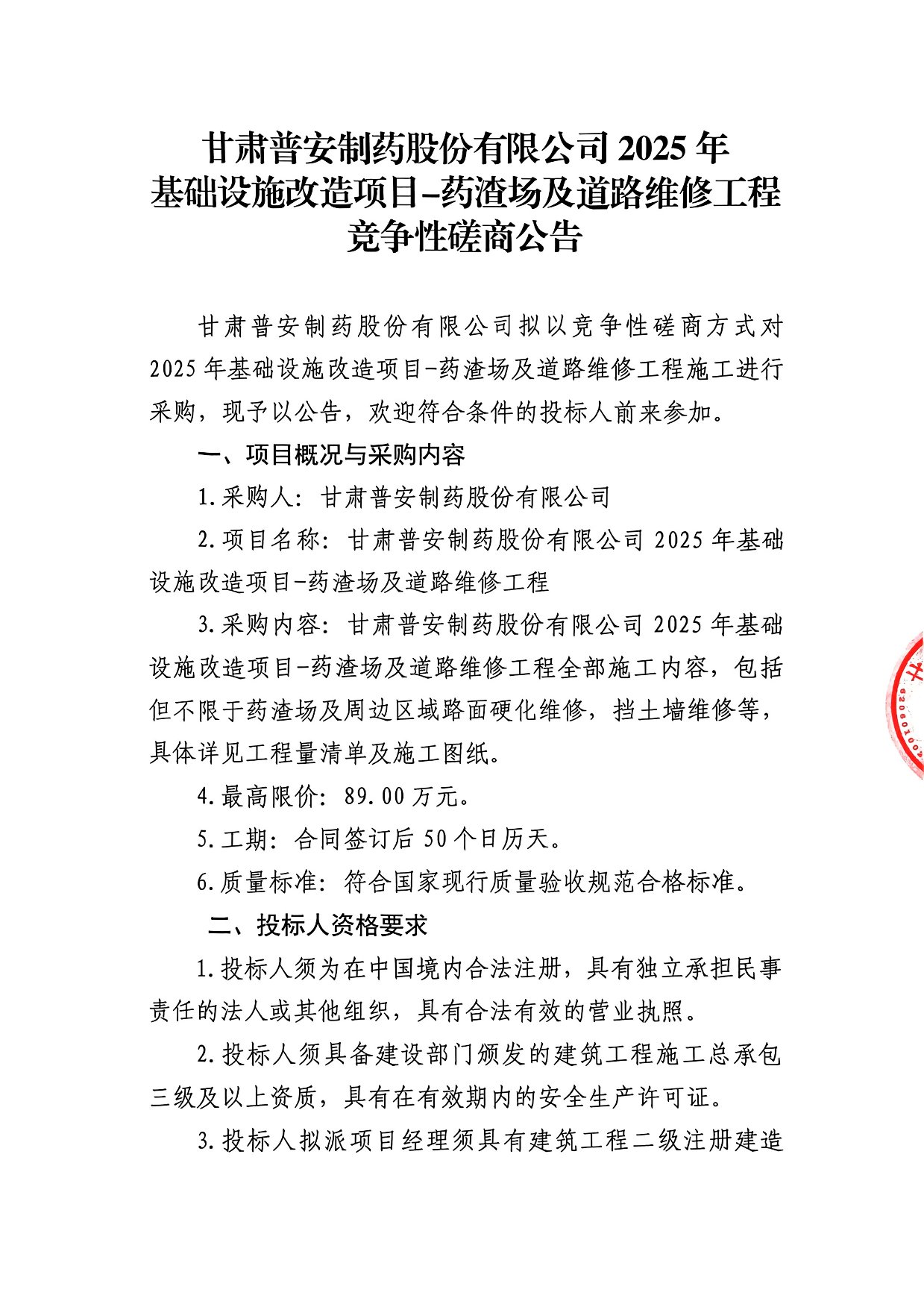 甘肅普安制藥股份有限公司2025年基礎設施改造項目-藥渣場及道路維修工程競爭性磋商公告