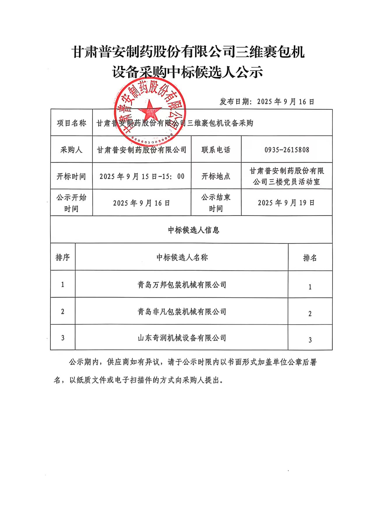 甘肅普安制藥股份有限公司三維裹包機(jī)設(shè)備采購(gòu)中標(biāo)候選人公示